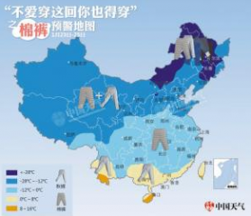 中国天气网因为此低温天气发布了“不爱穿这回你也得穿之棉裤预警地图”,引发人们对天气和棉裤的种种讨论。